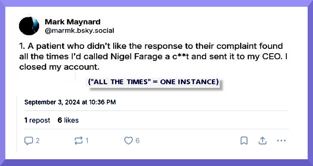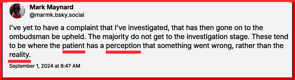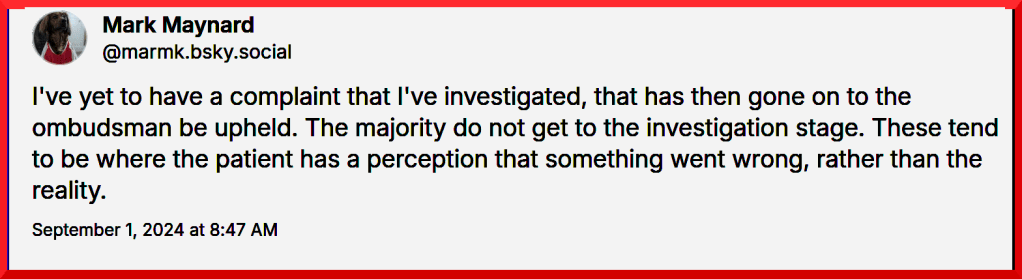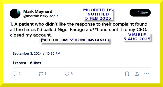 On November the 10th 2024, Mr Maynard registered his contempt for formal mechanisms that help improve the NHS (Complaints/PALS), whilst revealing his contempt for members of the public (patients) engaging with PALS & Complaints, and for Dr Martin Kuper, CEO at Moorfields.