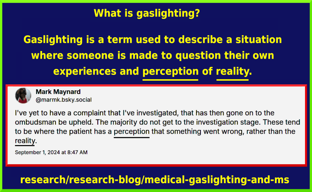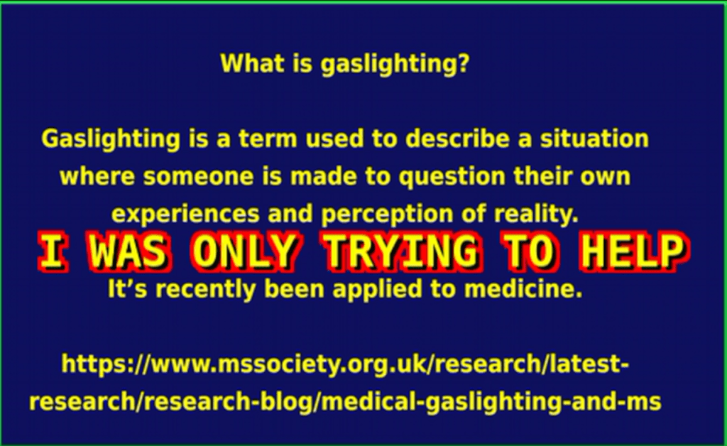 ” … The American Journal of Medicine recently published a commentary acknowledging medical gaslighting, stating “gaslighting in medical contexts is often due to the physician’s lack of awareness or understanding of disease entities, preconceived notions about specific clinical presentations, subliminal/unconscious bias toward certain patient populations, or simply arrogance in presuming physician superiority in clinical knowledge and decision-making (Ng et al., 2024, p. 1) … ”