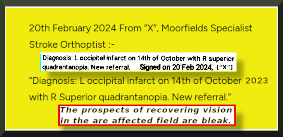 Also within this period, I was told my vision was “OK” on about four separate occasions, “perfect” on about three separate occasions, “no problem” on about three other occasions, and that the stroke had not affected my visual pathway.