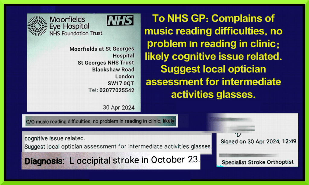 Having then demonstrated I was not able to read ordinary text fluently, I was treated to yet more fallacious rationalisation: “X”: There’s nothing I can do for this slowness, for this speed … You need to move the eyes sir … you read perfectly this line … if you move the eyes … following the line … YOUR VISION IS PERFECT ! … ‘no it’s not’… Angrily: Sir I’m checking your vision now …THIS IS MY JOB! … ‘you must listen to me’ … I objected … etc., and after “X” had further elaborated the complaint (C/O) that I didn’t make, distorting that which I had made clear, i.e. that I can’t see the next bar (etc) to the right because of the central hole in my vision, and twisting it to “Complains of music reading difficulties”, “X” continued to aggressively advance her glasses-as-remedy theory, off the back of her false “C/O” claim, for other NHS personnel, and data analytic systems, and which also misleadingly claimed: “No problem in reading in clinic”.