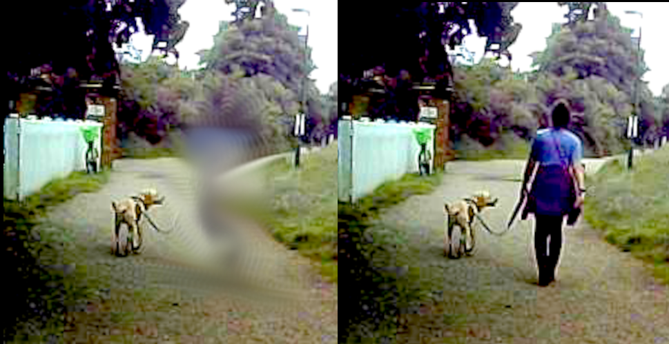 First up was the disappearing lady, adjacent photos of two ladies on a notice board. I was asked to blink my eyes, to see if the second lady to the right would re-appear, and when that didn’t work “X” enquired: “When does it happen? Does it happen just when you look at the music?” I introduced the disappearing pedestrian, the vanishing dog walker, and the disappearing / reappearing traffic, which sparked off a frantic: “Can you see my finger sir?” slap-dash “examination” by “X”.. and again: “Can you see my finger?”, ‘but your eye’s missing’, “Doesn’t matter”.“Can you see my finger?…Can you see my finger?…how many?” ‘Two’ – The Correct Answer
