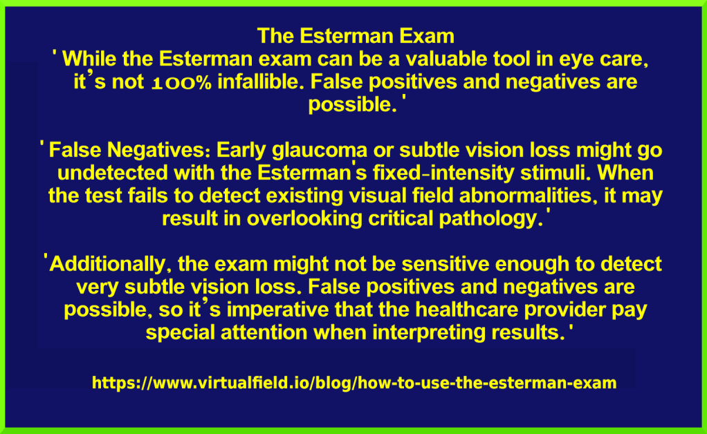 The entire post Esterman visual field test appointment appeared to be a flagrant archetypal example of “changing” facts to fit a theory.