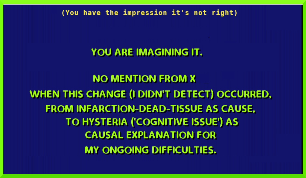 The chilling response from “X” was: “You can see well sir …. it’s a cognitive issue…. you have the impression it’s (ed. my VF defect) not right”
