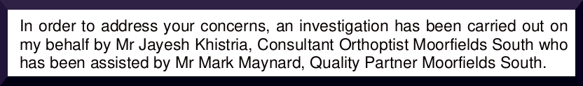 In order to address your concerns, an investigation has been carried out on my behalf by Mr Jayesh Khistria, Consultant Orthoptist Moorfields South who has been assisted by Mr Mark Maynard, Quality Partner Moorfields South.