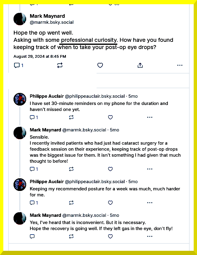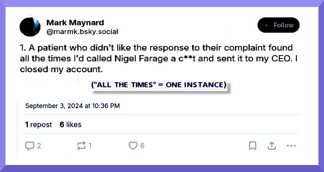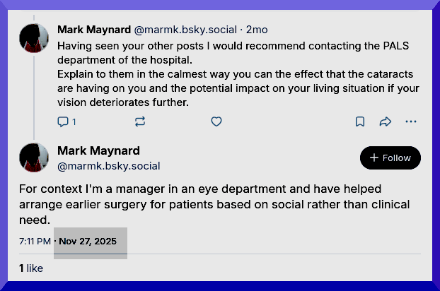 This was publicly signalled on the Social Media Platform Bluesky where his ‘followers’ (500+) can readily deduce which “eye unit” / “clinic” / “CEO” / “hospital” and area wherein he holds the post of “quality manager” where: “It’s a real problem getting access to records for patients…”. This suggests a culture undermining Patients Rights is permitted & tolerated within our NHS ….