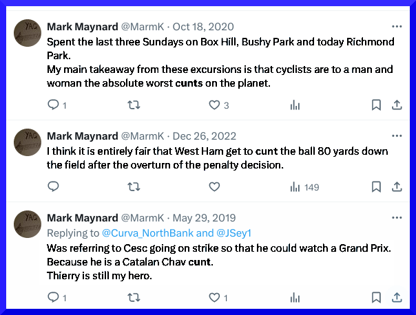This is from the same individual who referred publicly to the much younger gentleman, Francesc Fabregas Soler, as “a Catalan Chav c**t”, and who joked online about a tragedy involving children, the day after it’s occurrence, one of whom I understand passed away in the hospital Maynard appeared to be operating from. ….. I have been exposed to abusive and dishonest behaviour. I would appreciate an appropriate and respectful apology, attached to full documentation … Please could you ensure and confirm for me that this email is copied / forwarded to whoever has taken the place of Dr Martin Kuper…”