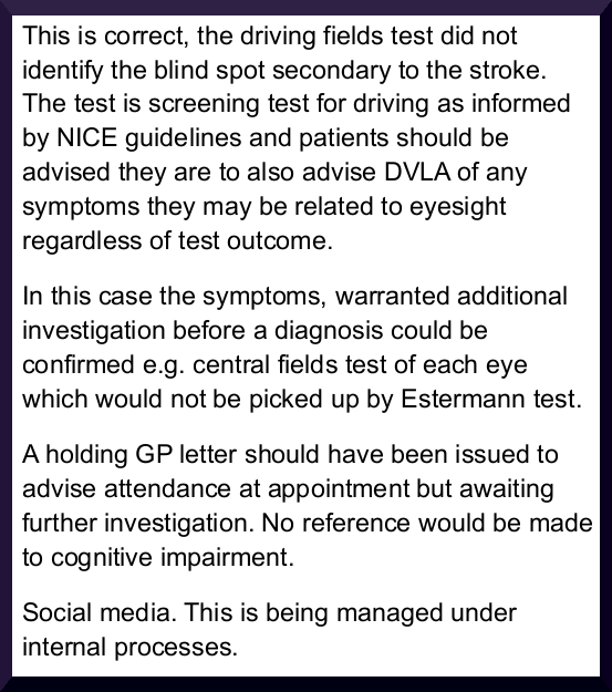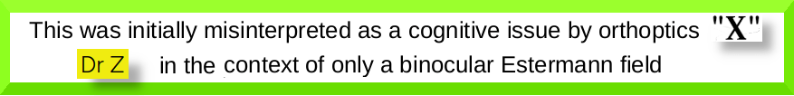 Later I was informed that: “The stroke can at times affect the vision but you have no problem at all about vision caused by stroke”. “X” showed me a copy of the Esternman results, destined for an NHS Consultant and my GP Practice … I said ‘but it’s not right’. “X” quipped: “That’s OK you can say it’s not right but this is evidence your vision is perfect“.