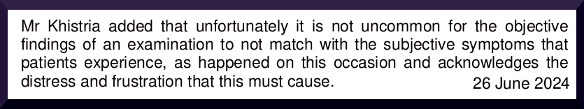 Mr Khistria added that unfortunately it is not uncommon for the objective findings of an examination to not match with the subjective symptoms that patients experience, as happened on this occasion and acknowledges the distress and frustration that this must cause.