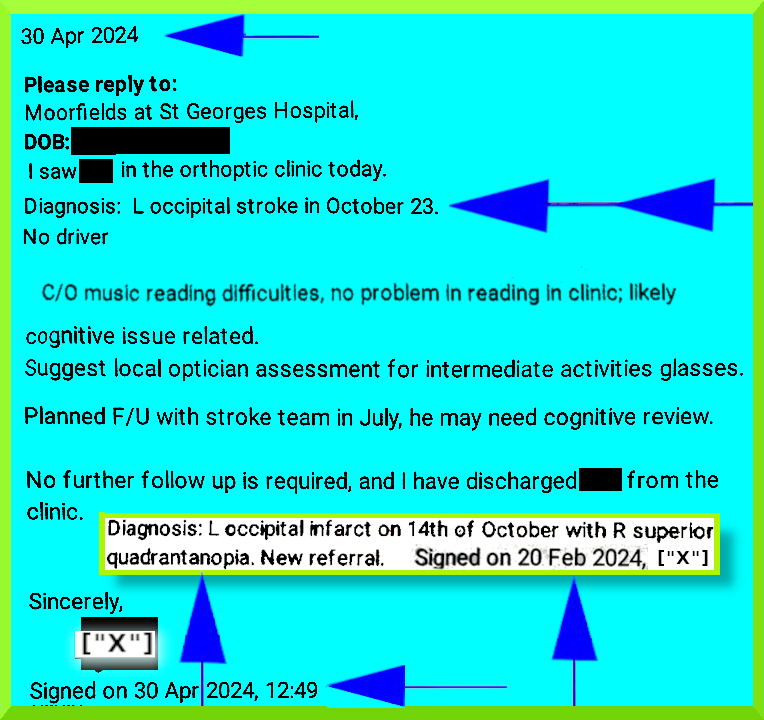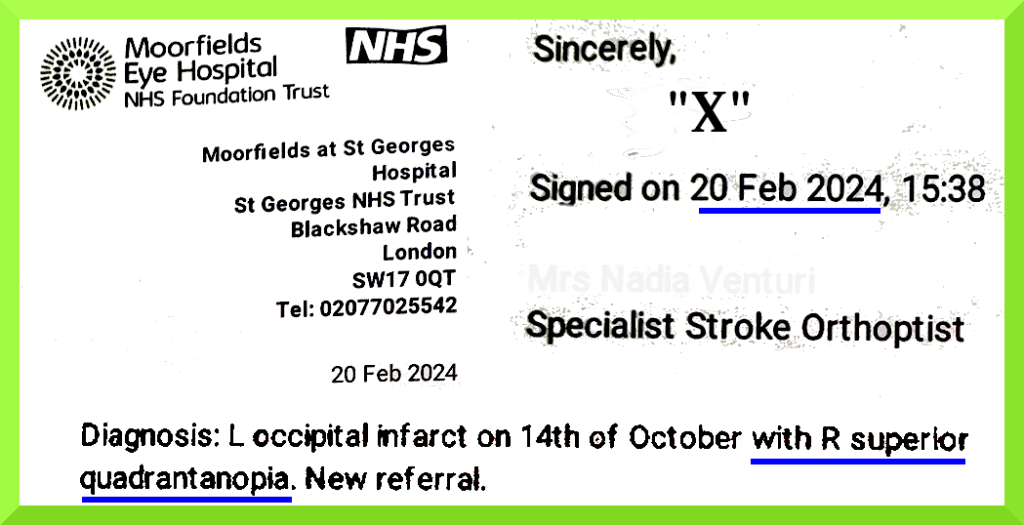 November 20th 2023: “Dear [GP Practice] Please Find attached … optician report from 12/11/2023. [ed. requested by GP Practice before any referral could be made] I am very troubled by what I understand to be homonymous hemianopia. This follows cerebral infarction of 12/10/2023 ….etc.” [12th November 2023 = “eye check“]