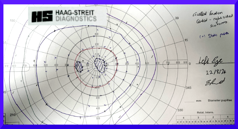 …. Four and a half months later, on the 10th January 2025, I caught sight of a referral letter from Moorfields to Professor C, dated 22nd August 2024, whilst attending an appointment with Dr B , at the Neurology, Stroke, and TIA Service at St Georges Hospital. …. Unaware this document existed, I attended the above 10-01-25 appointment with my own ‘results’ from an online blind-spot mapping tool (p5) …. so that Dr B might get a more accurate picture of my deficit than I am able to detail verbally, and which deficit had been aggressively denied by a “X” of Moorfields …