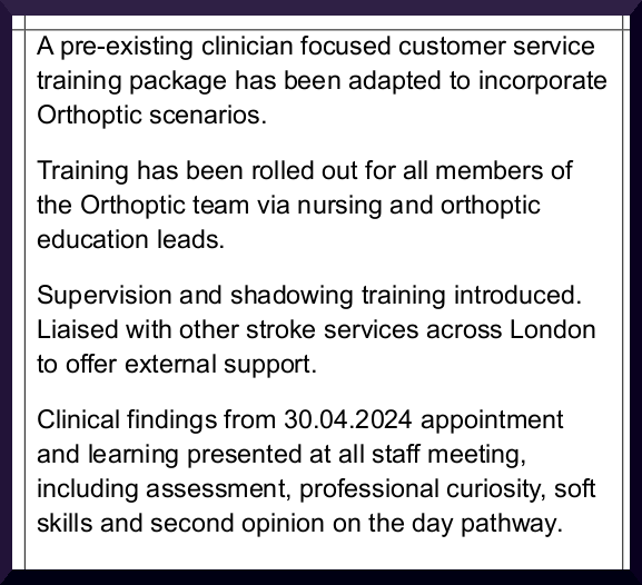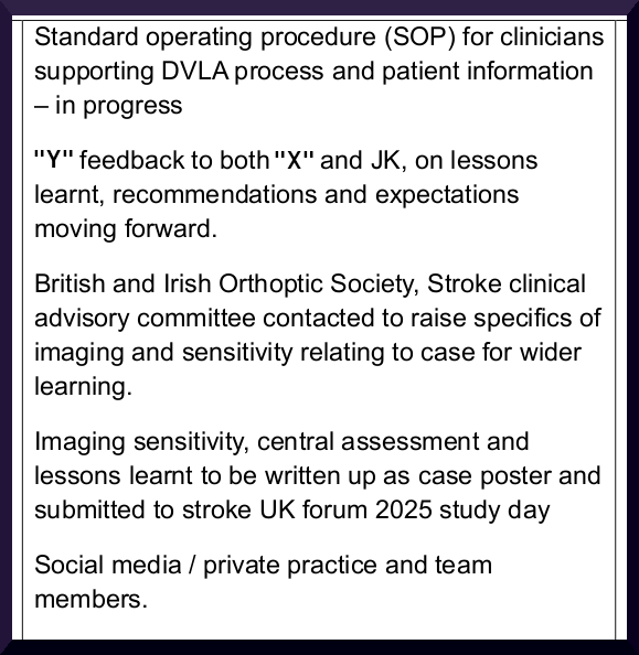 07 Jan 2025: I was advised of changes, improvements, and some actions taken, which included: Patient information leaflets to be readily available from Driver and Vehicle Licensing Agency and The British and Irish Orthoptic Society regarding notifications of symptoms.